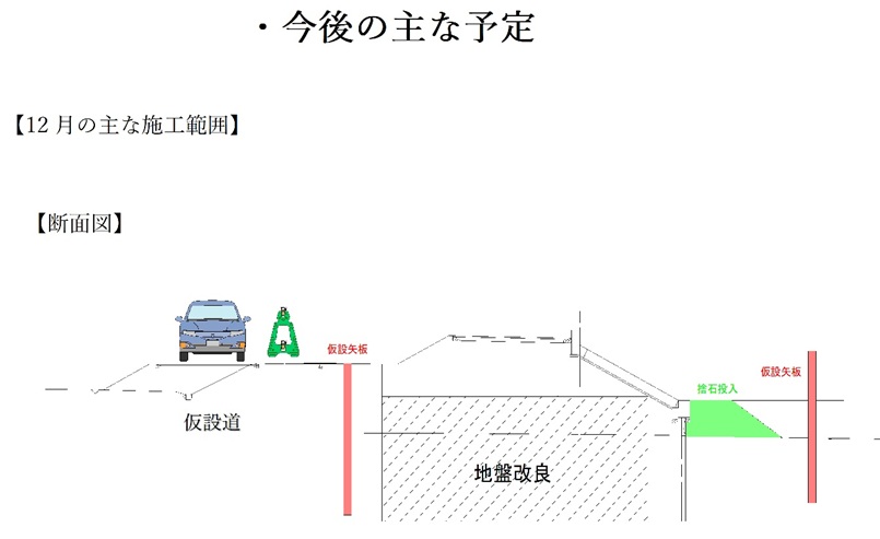 本工事での工事車両の出入りにより付近を通行される車や歩行者、近隣の住民の皆様にはご迷惑をお掛けいたしますが、安全第一に作業させていただきますので、ご理解・ご協力をお願いします。