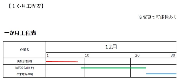 さて現場の方ですが、12月より仮設鋼矢板を油圧式高周波型バイブロハンマー (低振動・低騒音)を使用して海側より撤去し、陸側の撤去という手順で施工してまいります。