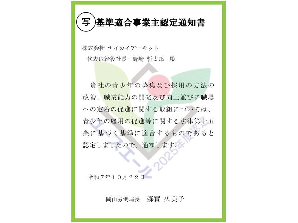 このたび当社は、厚生労働省より「ユースエール認定企業」として認定されました。