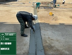 2号配水池ですが、現在耐震補強の為のせん断補強筋の打設も終わり、配水池内に点在するひび割れの修復と配水池内の目地箇所に段差が生じた場合に段差箇所から水が漏れないように伸縮性のあるゴムを取付けるための下処理を行っています。