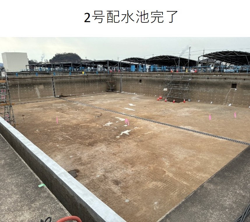 鶴新田浄水場の現場では現在2つある水槽の内の1つと水路の施工が完了しております。