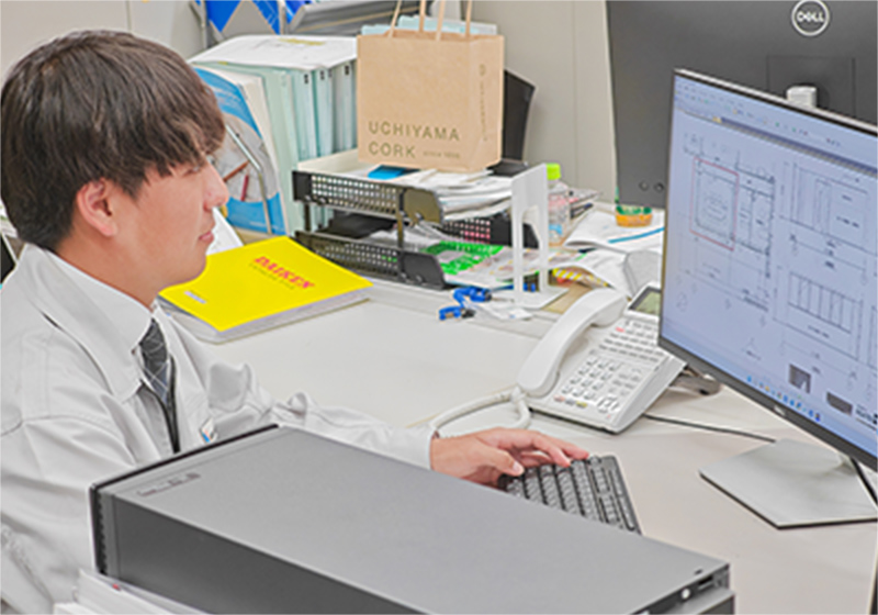 現在は、入社してから取り組んでいる取引先の図面を書いています。現場を経験した方がよいと思い、品質管理なども担当しています。設計業務は営業からの案件を引き継いで営業と一緒にお客さんと打ち合わせして建物の設計図を仕上げていきます。取引先と打ち合わせの資料を準備することや行政に出す書類提出などもあります。